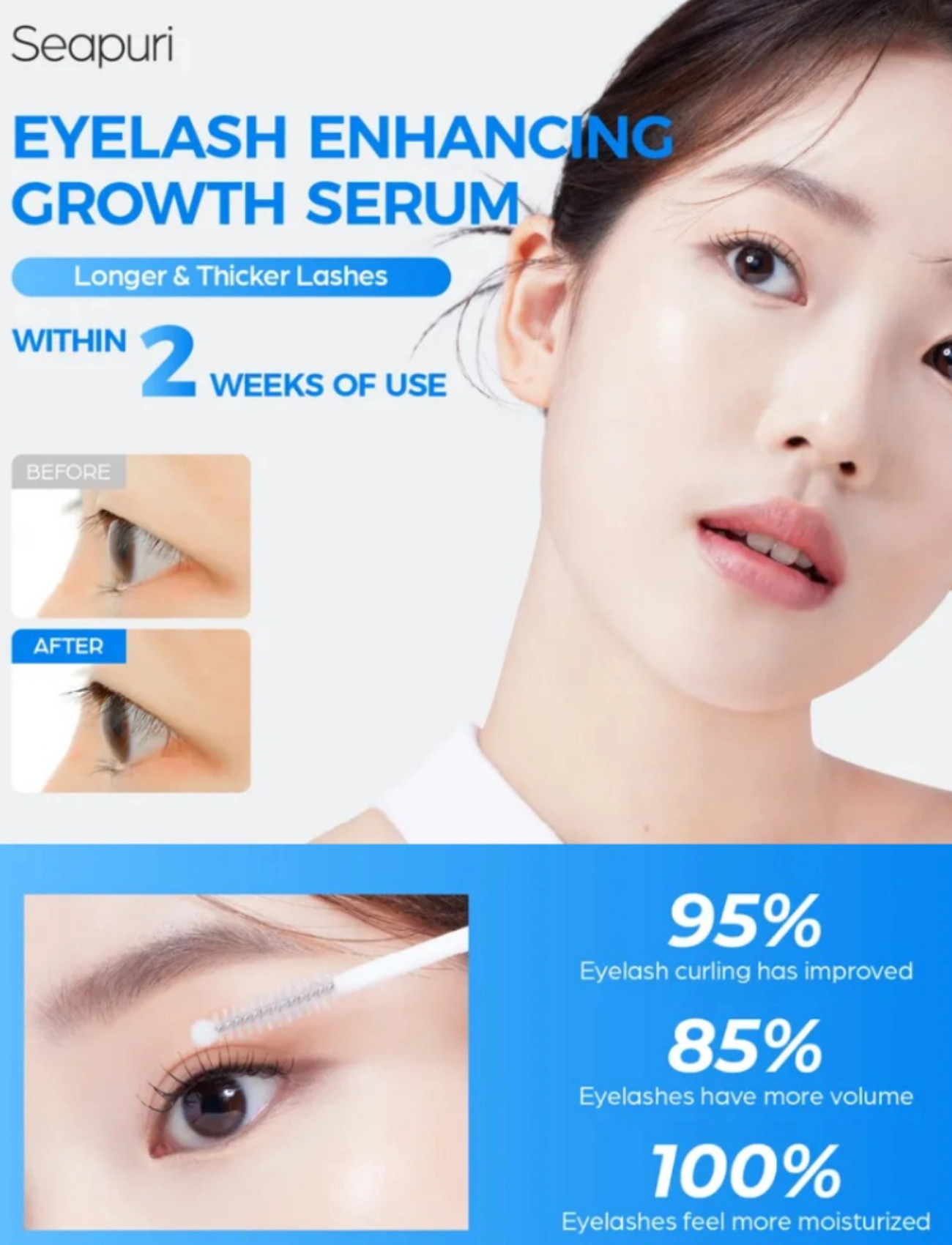 سرم تقویت مژه Seapuri با هدف تقویت فولیکولها و افزایش طول و ضخامت طبیعی مژهها طراحی شده است. بسیاری از مشکلات مژه مانند نازکی، کمپشتی و ریزش ناشی از ضعف ریشه و کمبود مواد مغذی است. پپتیدهای فعال موجود در این سرم، رشد کراتین مژه را تحریک کرده و استحکام تارهای مژه را افزایش میدهند.